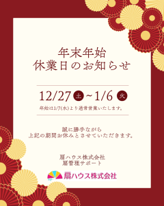 平素より扇ハウス株式会社のホームページをご覧いただき、 誠にありがとうございます。 大変勝手ながら、下記期間を年末年始休業とさせていただきます。 【年末年始休業期間】 2025年12月27日(土)~2026年1月6日(火) 休業期間中にいただきましたお問い合わせにつきましては、 営業再開日(2026年1月7日)より順次対応させていただきます。 ご不便をおかけいたしますが、 何卒ご理解賜りますようお願い申し上げます。